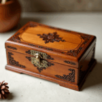 A handcrafted wooden box with delicate carvings, made from high-quality natural wood. The box has...